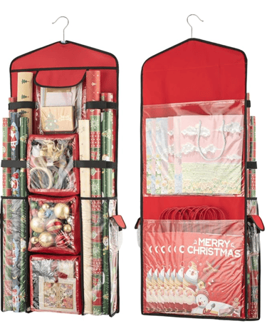 Exlifbag Wrapping Paper Storage Organizer: I love how this one hangs in a closet and is double sided making it great for smaller spaces. Different sizes of clear pockets allow you to easily see all of your ribbons and gift tags making this the ultimate organizer. (*paid link)