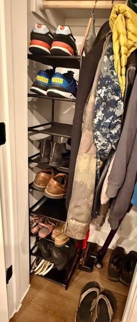 Don't just pile the shoes on the floor! Think vertical with a slim shoe organizer. Fits in the smallest of coat closets.